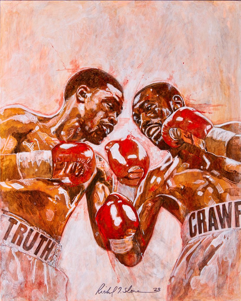 This artwork appeared on the cover of a special print edition of Ring Magazine which was published especially for this fight and served as the official artwork for the fight, as well as appearing in the official program for the fight.